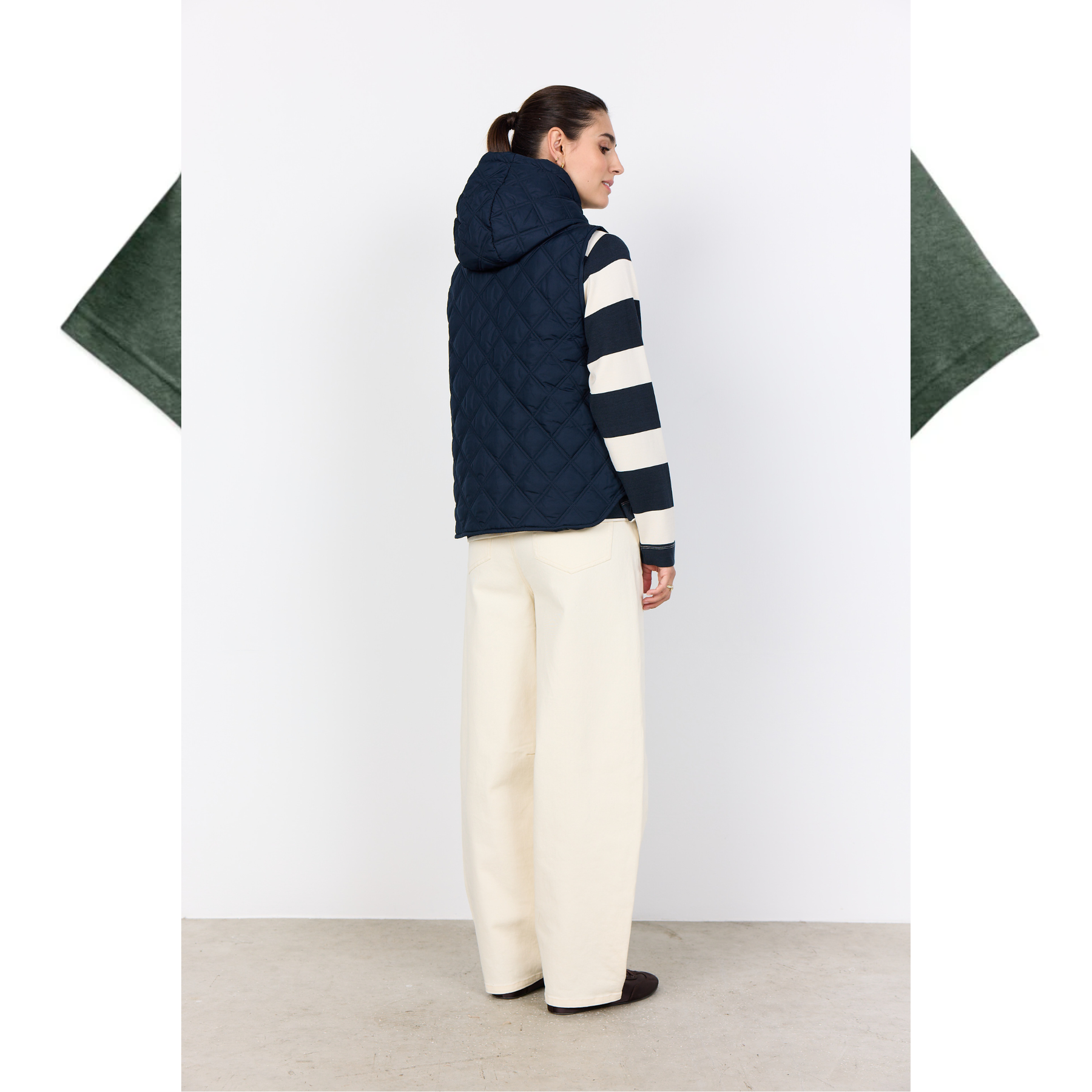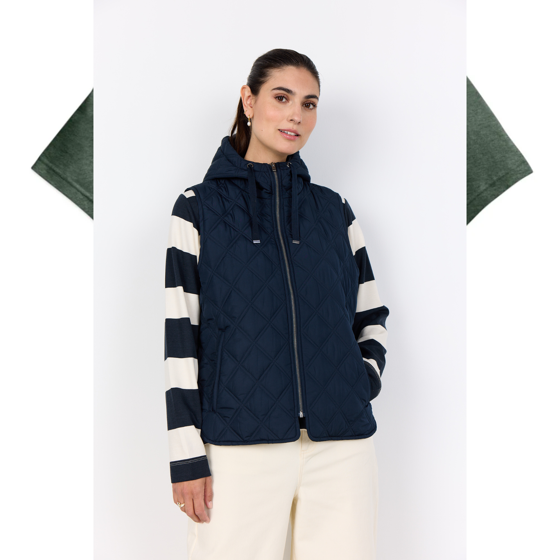 A stylish vest made from 100% Polyester. It features a quilted texture, high collar with drawstrings, and a full-length zipper front. Pair it with jeans and a sweater for an elegant and cool outfit.