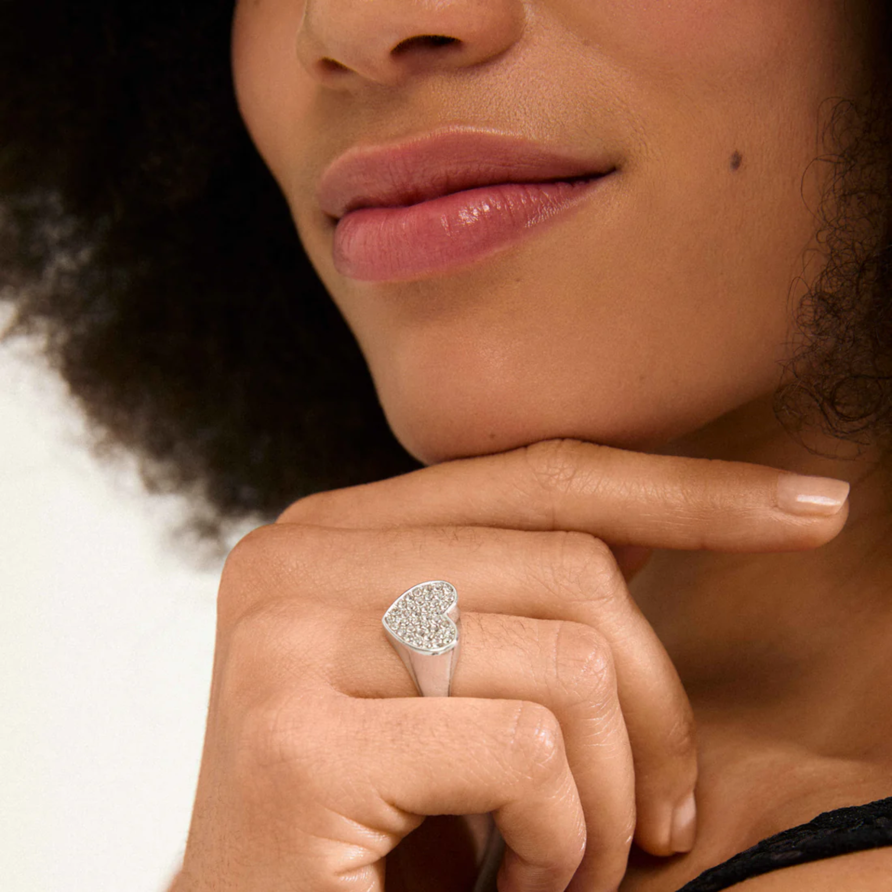 Shine with love! A gold-plated or silver-plated ring showcasing a large heart embellished with sparkling Preciosa crystals - a striking piece that brings maximum sparkle and romance to your look. Wear it solo as a statement piece, or combine with other rings for a stacked look that delivers an extra wow factor. A ring that elevates any outfit to new heights! This adjustable ring offers a perfect fit and is made from 98% recycled material, showing love for our shared planet.