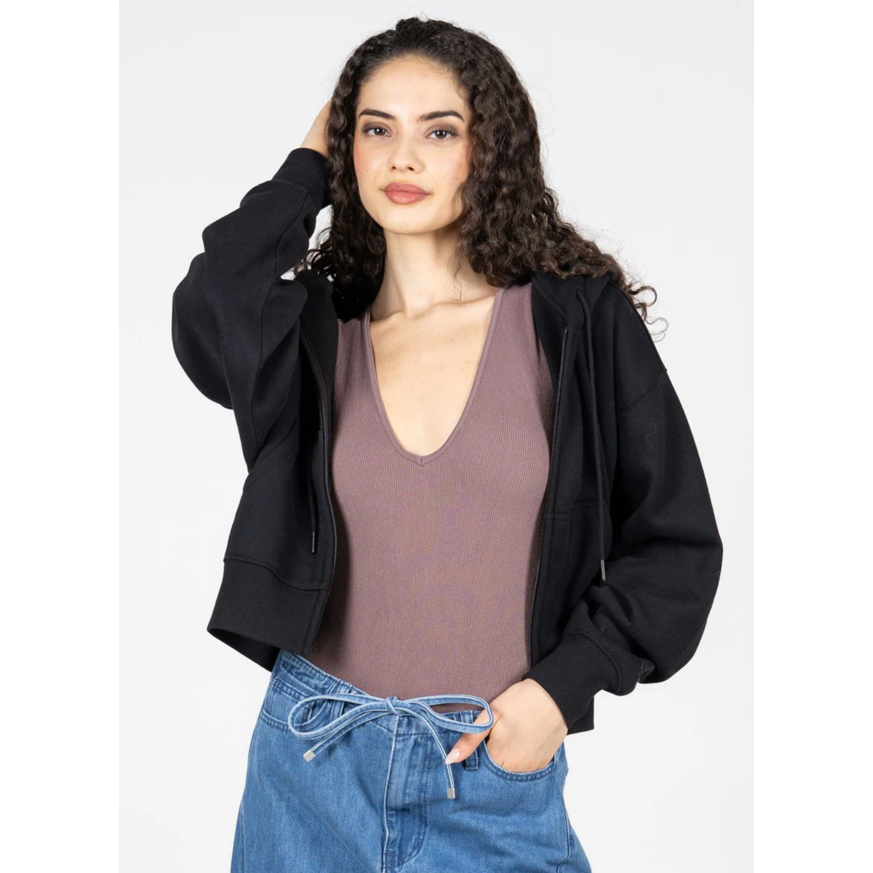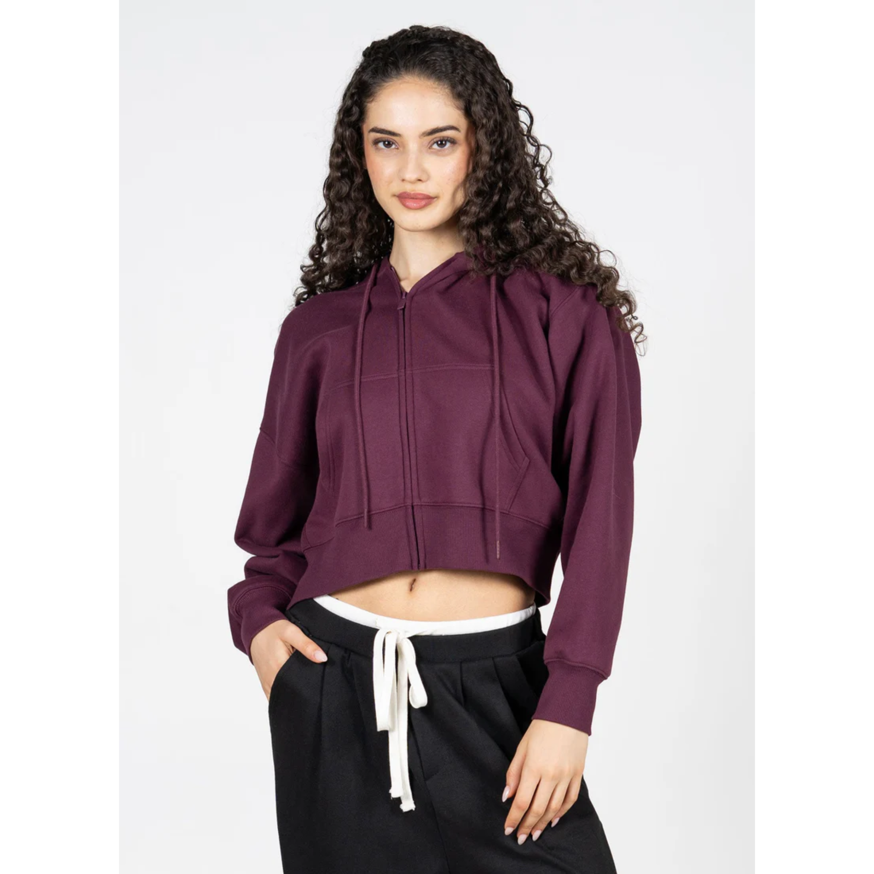 Recycled polyester cotton fleece hooded jacket with a front pocket and drawstring hood.