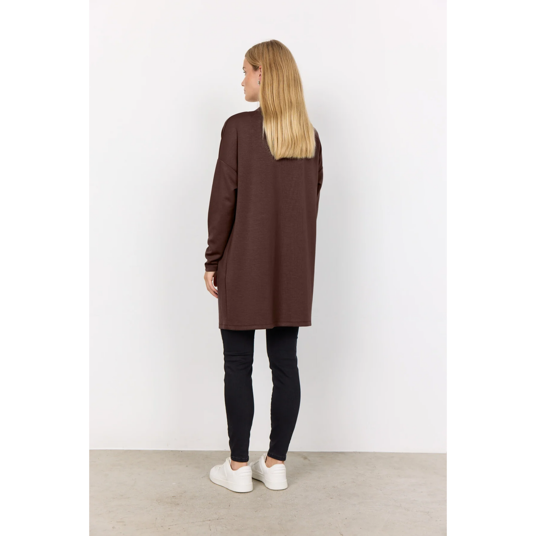 The Banu is a cardigan that features an open front design with a straight cut and long sleeves, providing a relaxed fit without closures or prints. Pair it with jeans and a t-shirt for a comfortable and relaxed look.
