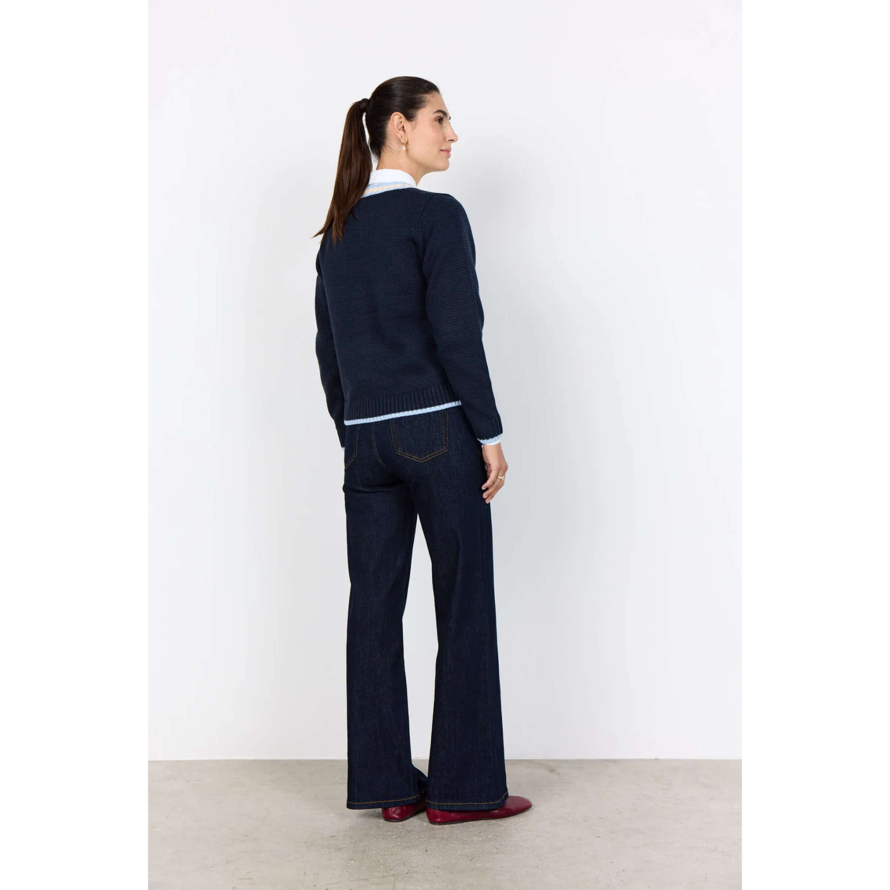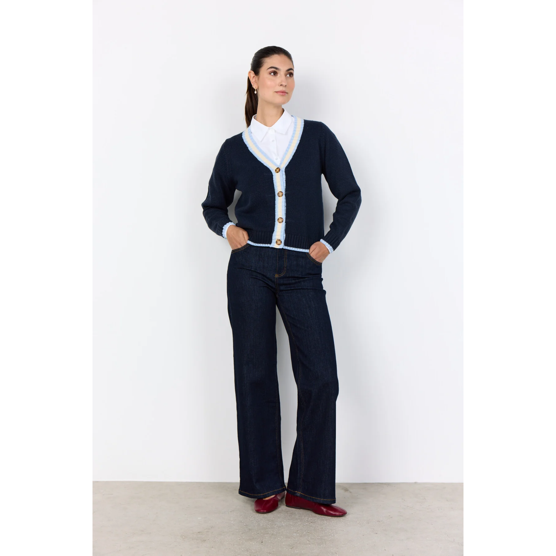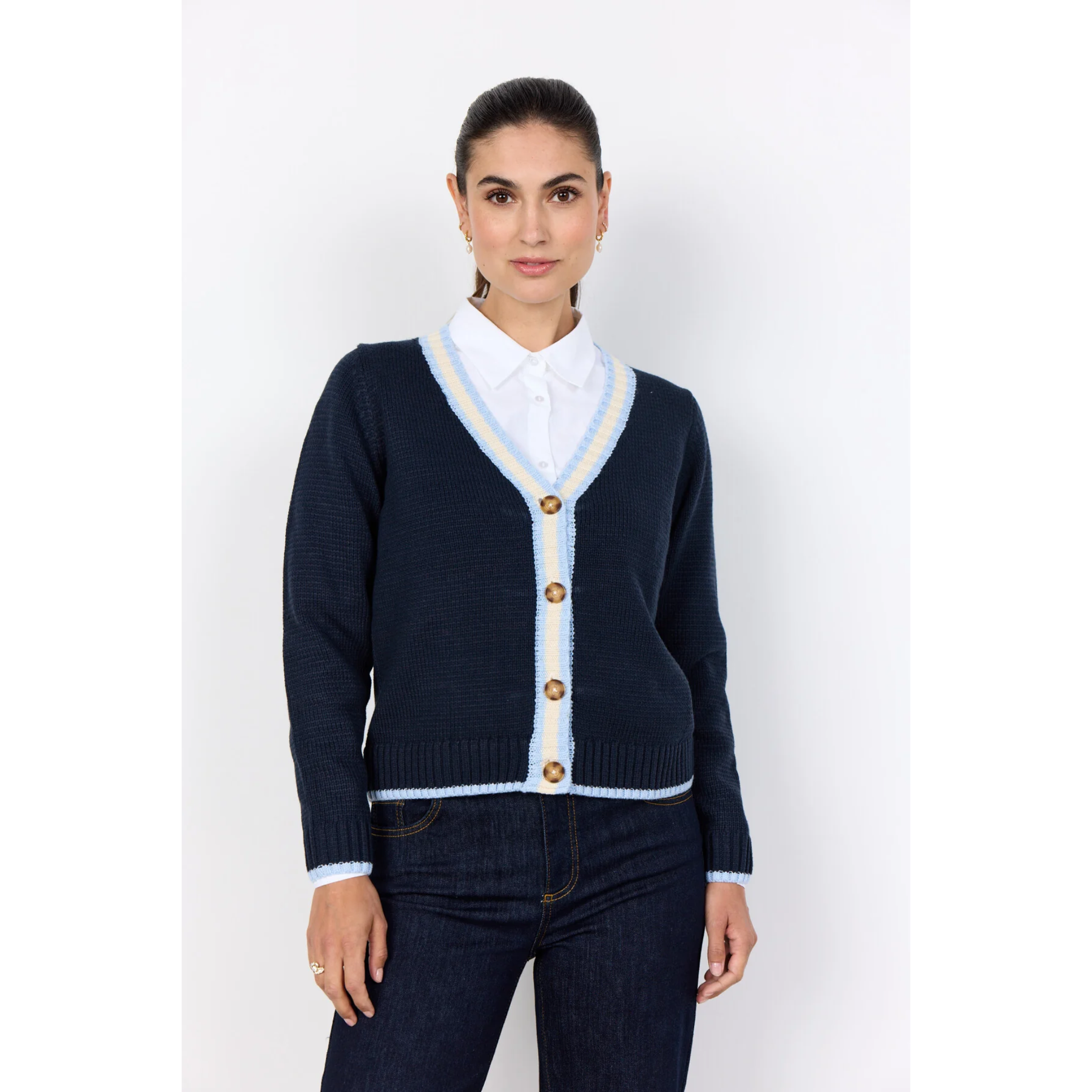 A cardigan made from 60% Organic cotton and 40% Acrylic. It has a V-neck design with contrasting ribbed trim, wooden buttons down the front, and a textured knit. Pair it with jeans for a casual look or layer over a dress for added warmth.