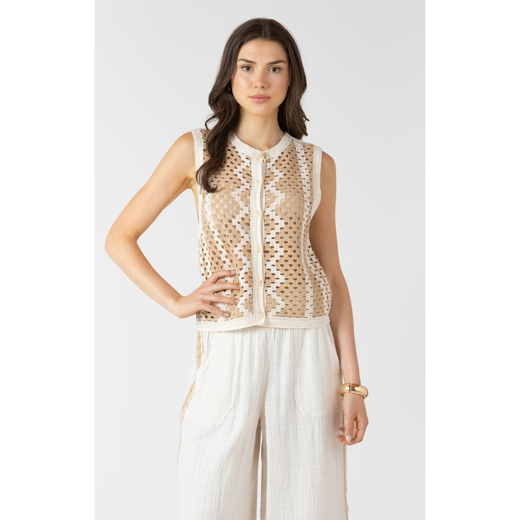 The Dex Open Work Sweater features a lightweight, breathable knit with intricate openwork detailing for a soft, textured look. Designed with a sleeveless silhouette and front button detail, it’s an effortlessly chic layering piece for any season.