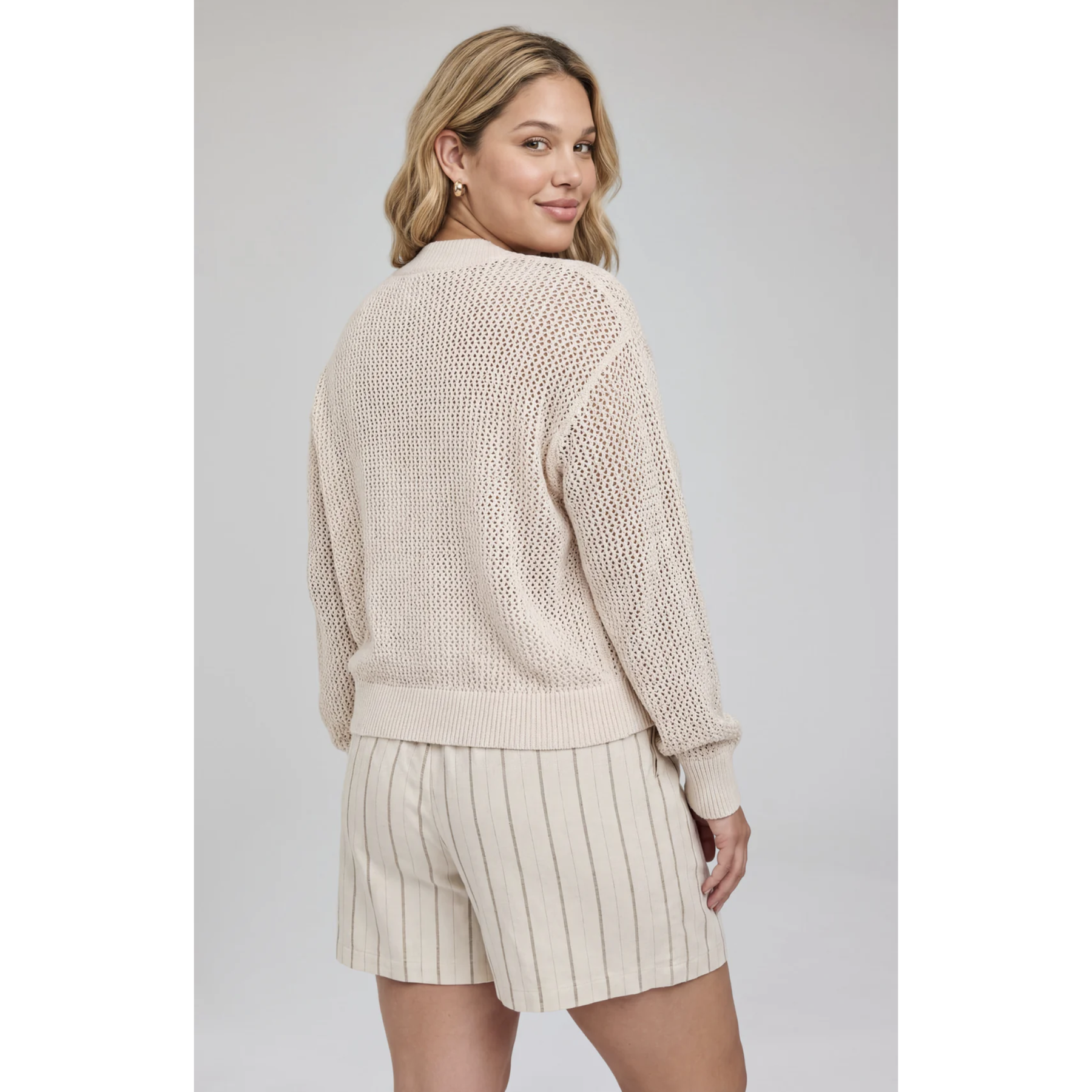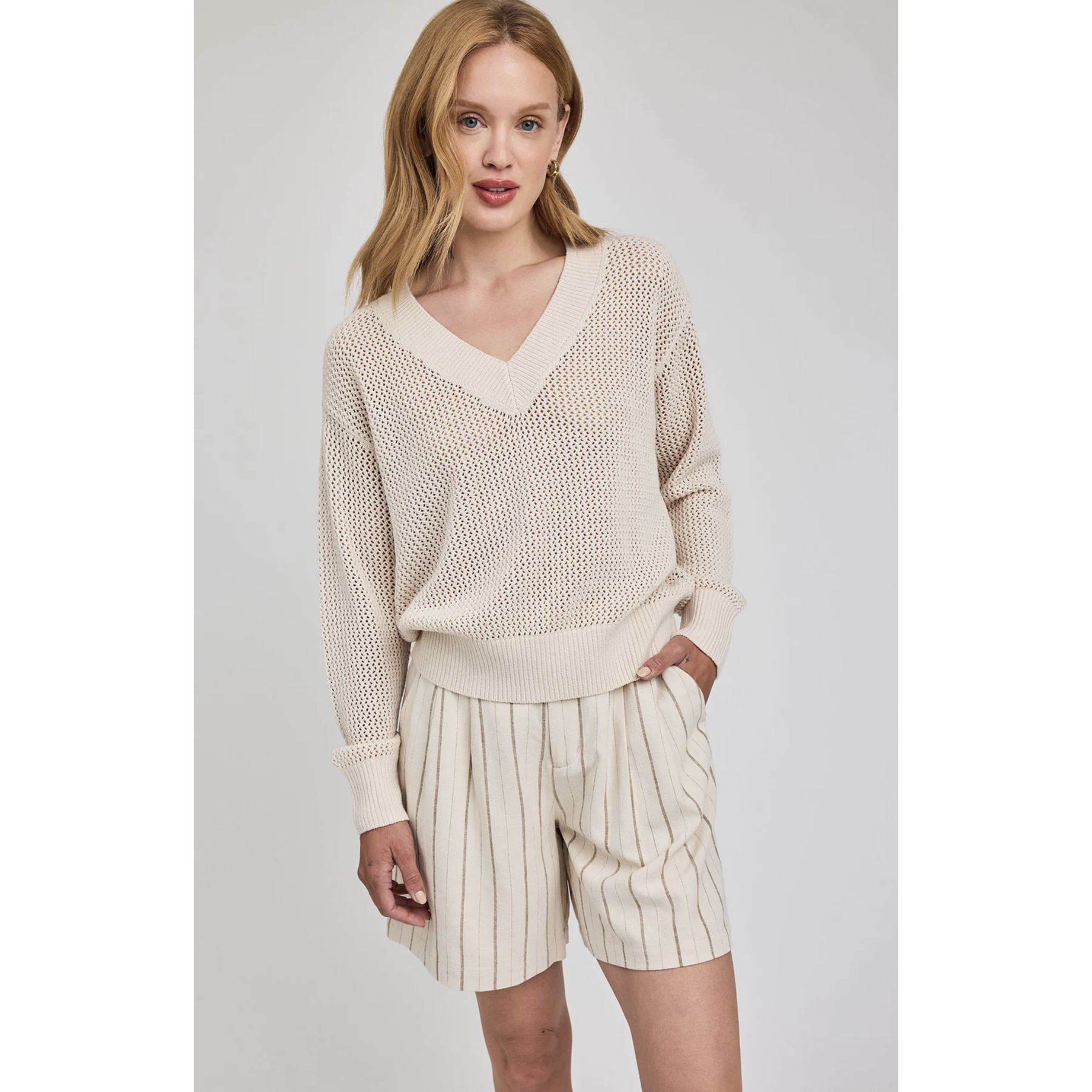 The Jensen sweater is made of a soft yarn in an open knit pattern. Features include a wide rib v-neckline and a relaxed fit for an effortless feel.